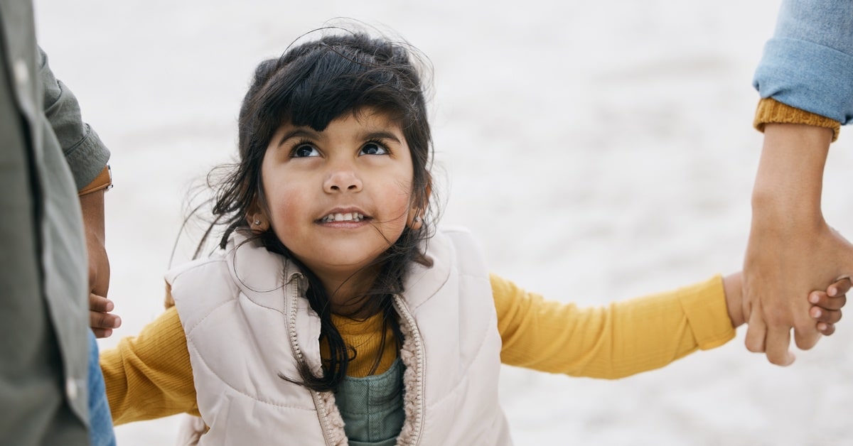 A child in a pink vest holds the hands of both of her parents as they walk. She looks up to the parent on her right.