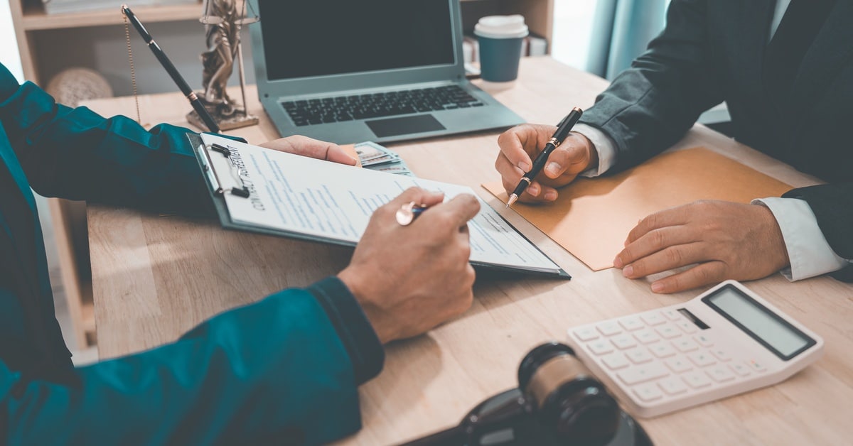 Two people sit across from each other at a desk. One holds up a document on a clipboard, signaling where the other should sign.